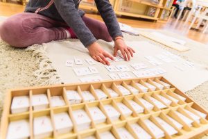 The moveable alphabet is a Montessori tool used to teach reading, spelling, and writing. There are multiples of each letter and each letter has its own compartment in a wooden box with vowels in blue and consonants in red.
