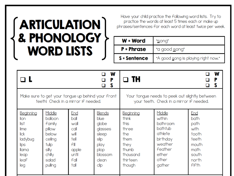 By:Natalie SnydersAt Home Word Lists for Articulation and Phonology for SLPs – FreebieArticulation and Phonology Word Lists with verbal cues and level checkboxes. Natalie Snyders is one of my favorite SLP bloggers and she has great resources! What I like about this specific word list sheet she made is how it lists the verbal cues